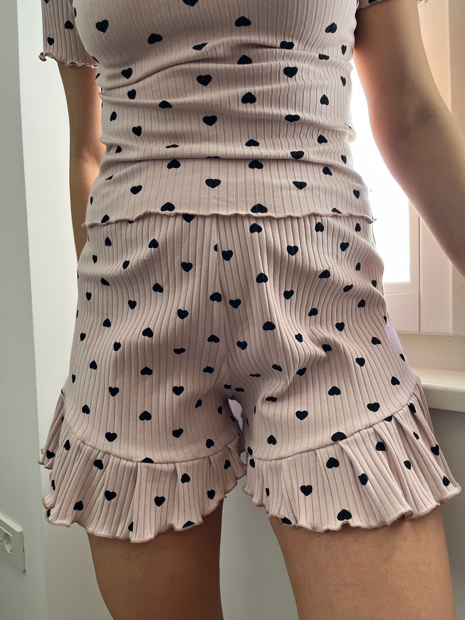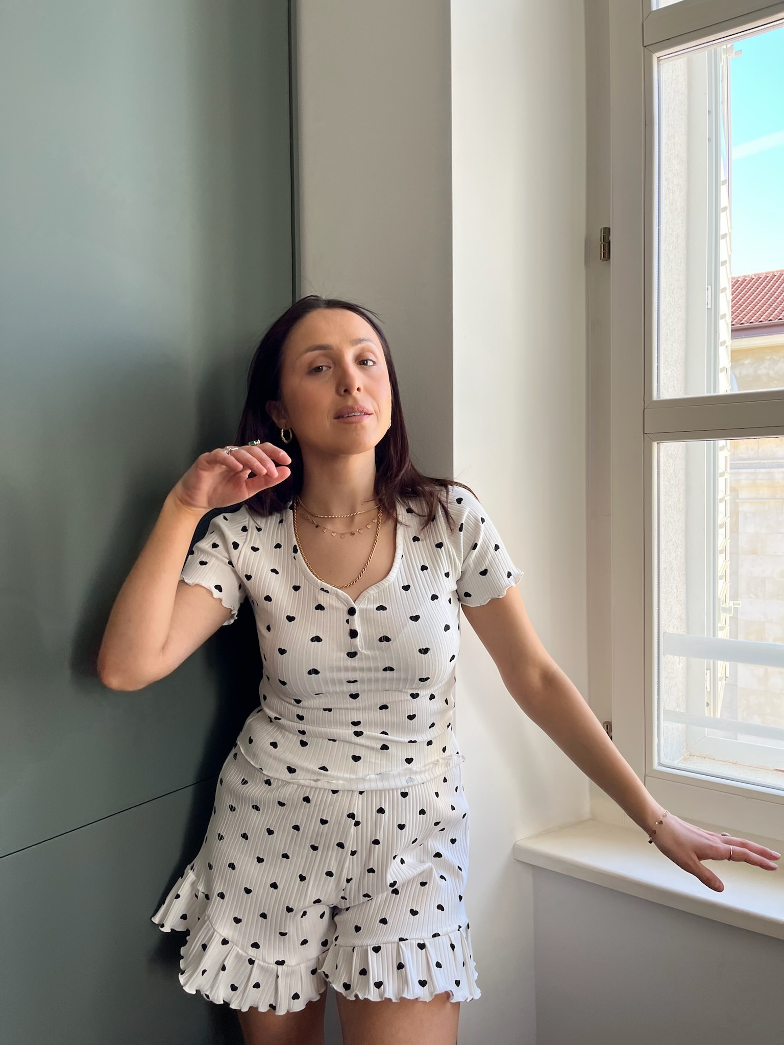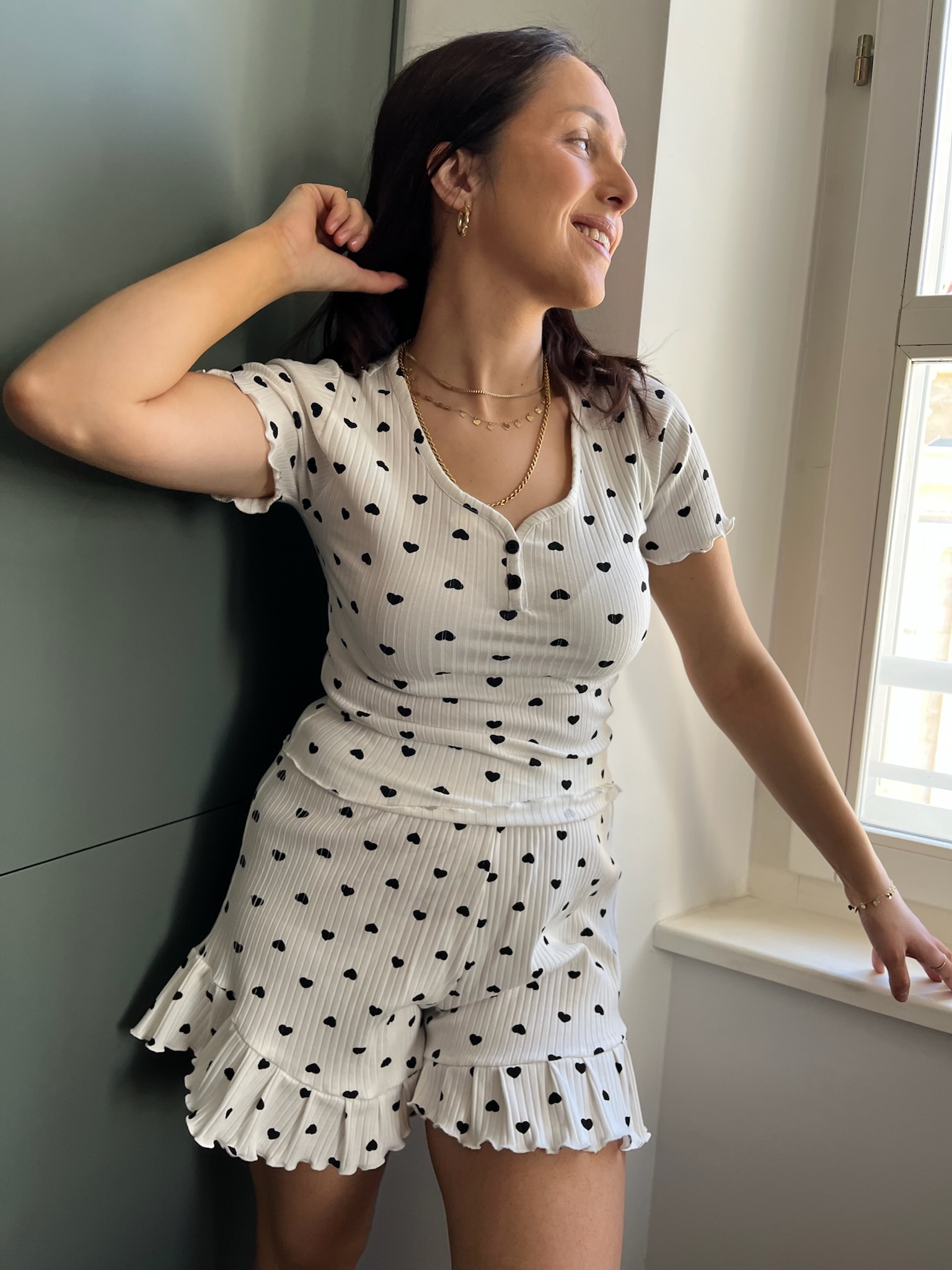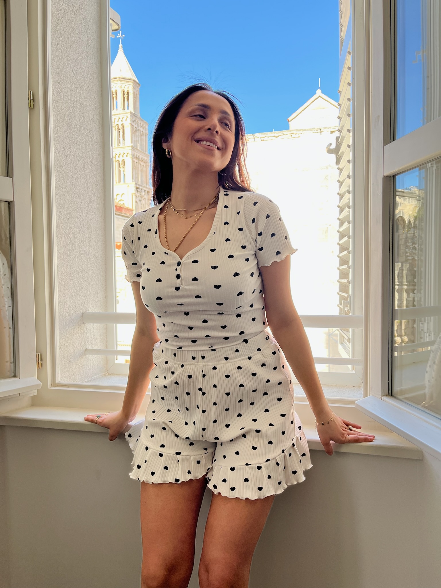 Ovaj set odiše svježinom i ženstvenošću, idealan za tople proljetne dane. Nježni dvodijelni komplet od laganog, rebrastog materijala u bijeloj boji, ukrašenom sitnim crnim srcima koji dodaju dašak razigranosti i romantike. Gornji dio je kratkih rukava s diskretnim valovitim rubovima, dok su kratke hlače visokog struka elegantno krojene i ukrašene volanima na rubovima, što dodatno naglašava opušten, ali dotjeran izgled.