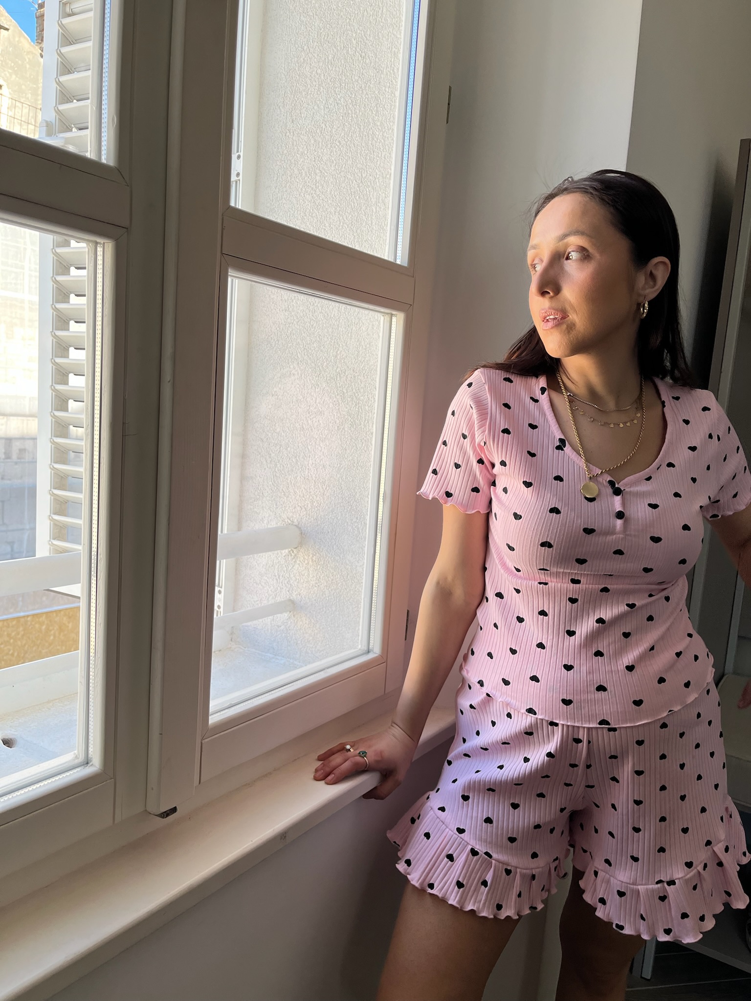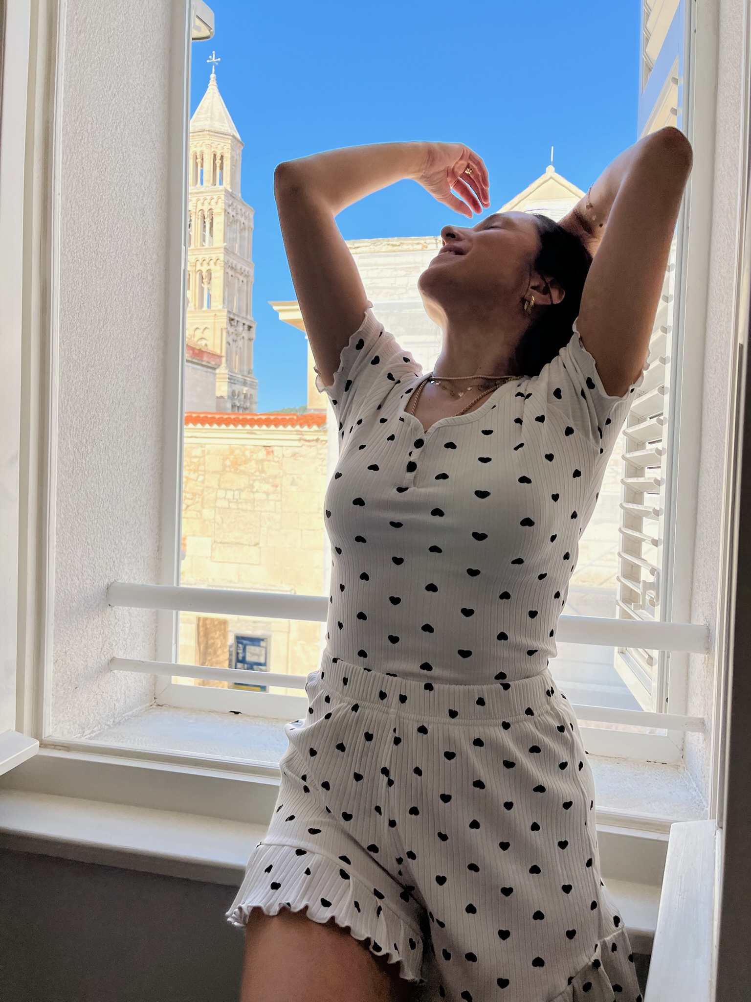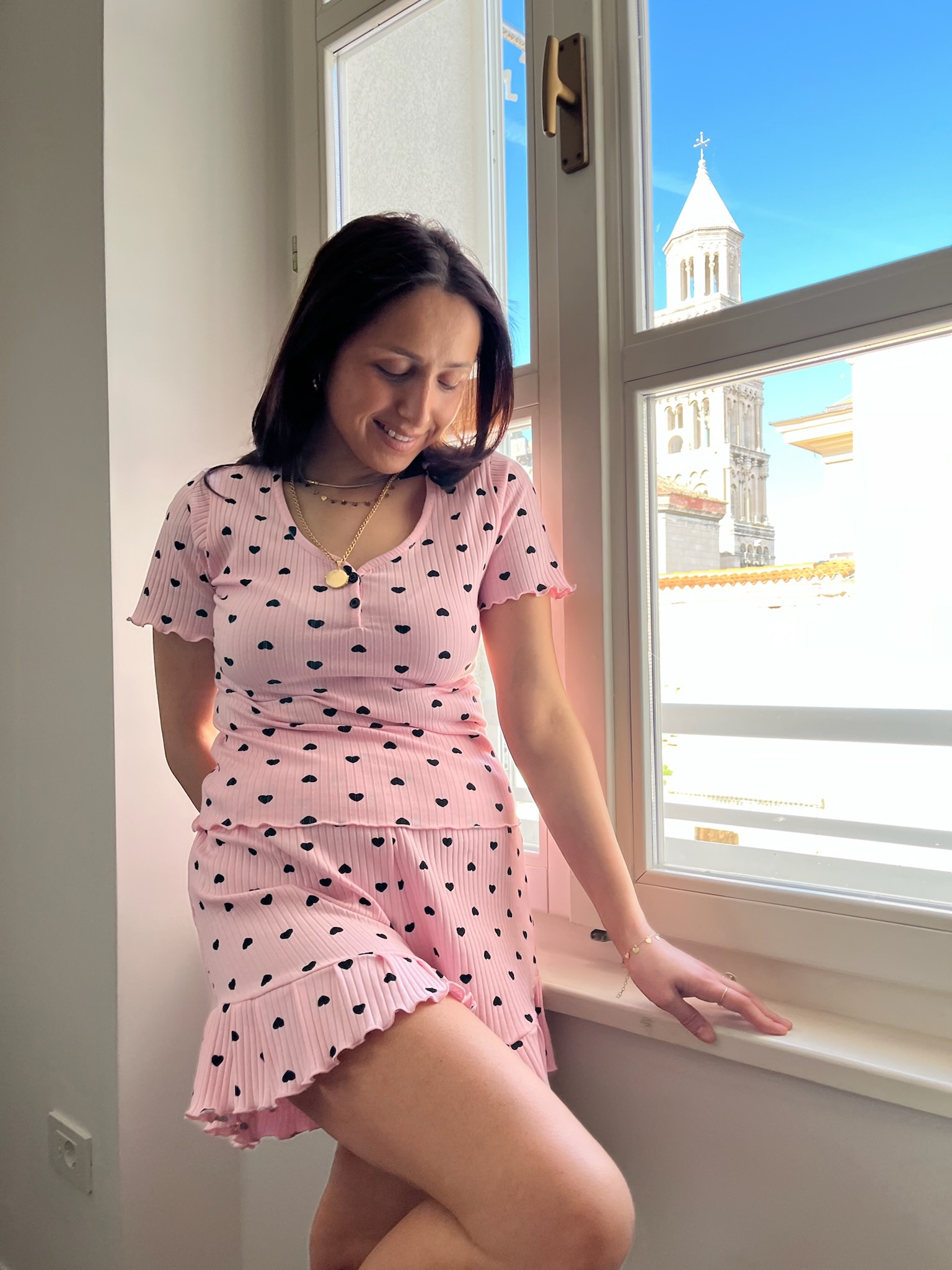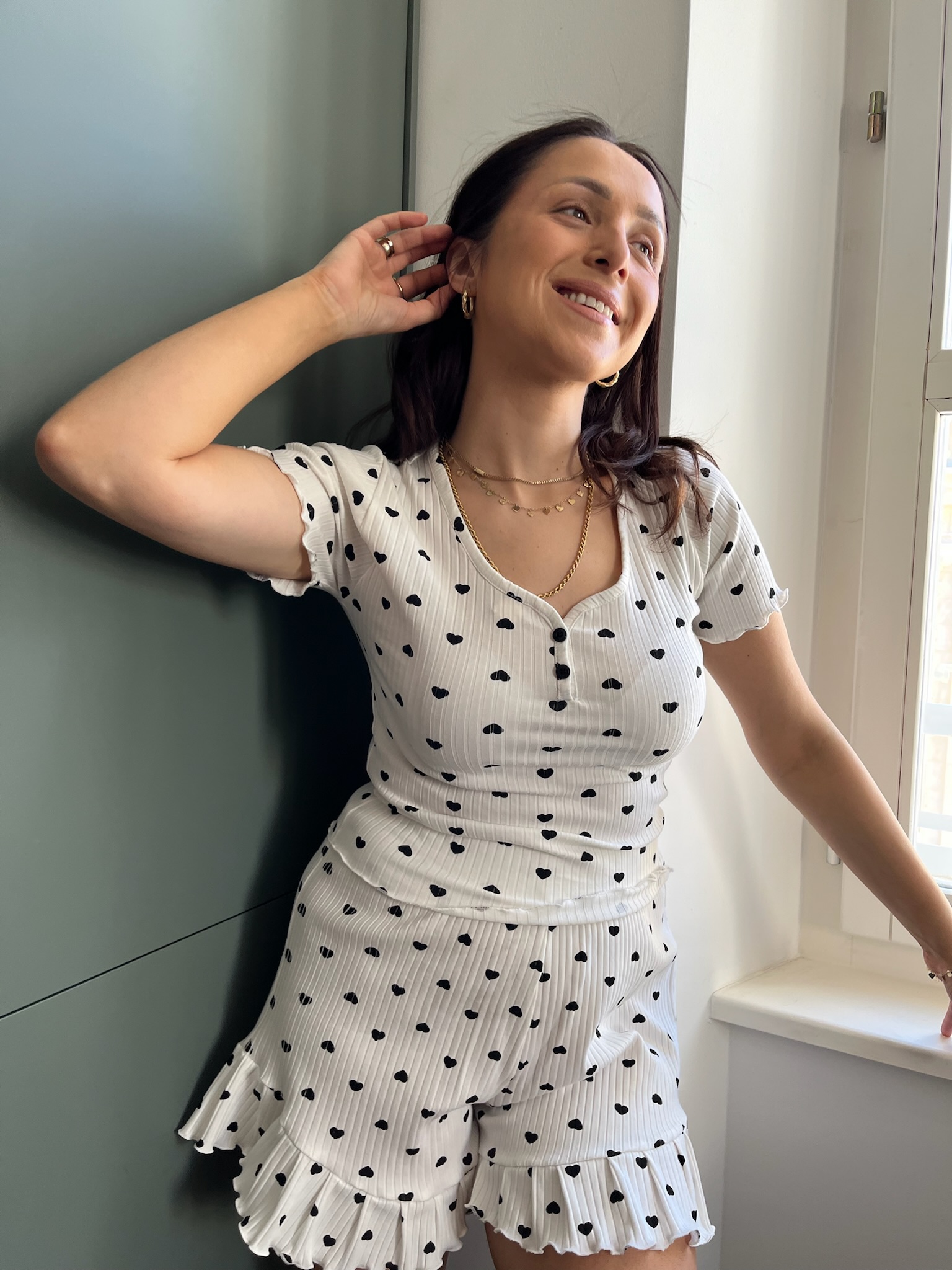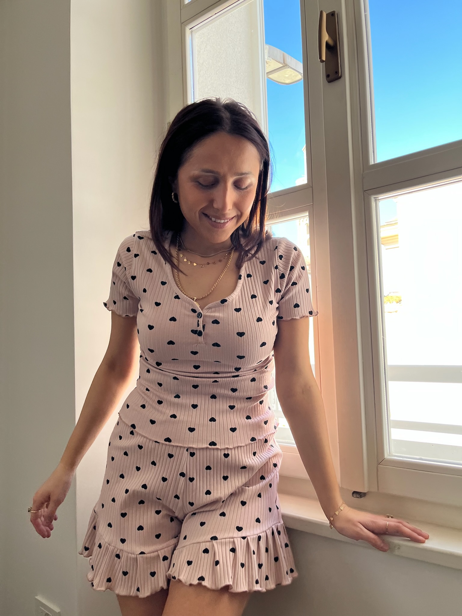 Ovaj set odiše svježinom i ženstvenošću, idealan za tople proljetne dane. Nježni dvodijelni komplet od laganog, rebrastog materijala u bijeloj boji, ukrašenom sitnim crnim srcima koji dodaju dašak razigranosti i romantike. Gornji dio je kratkih rukava s diskretnim valovitim rubovima, dok su kratke hlače visokog struka elegantno krojene i ukrašene volanima na rubovima, što dodatno naglašava opušten, ali dotjeran izgled.