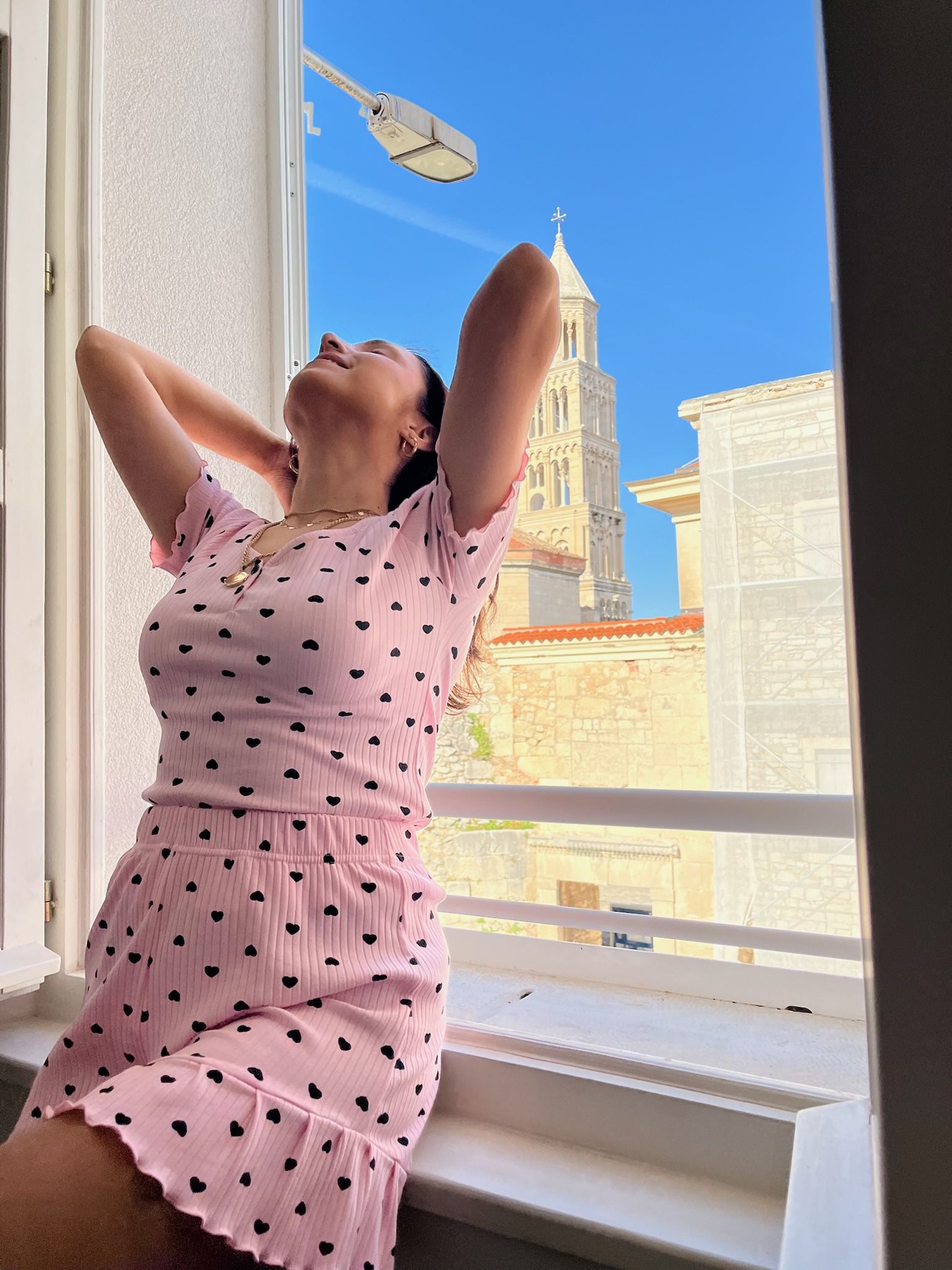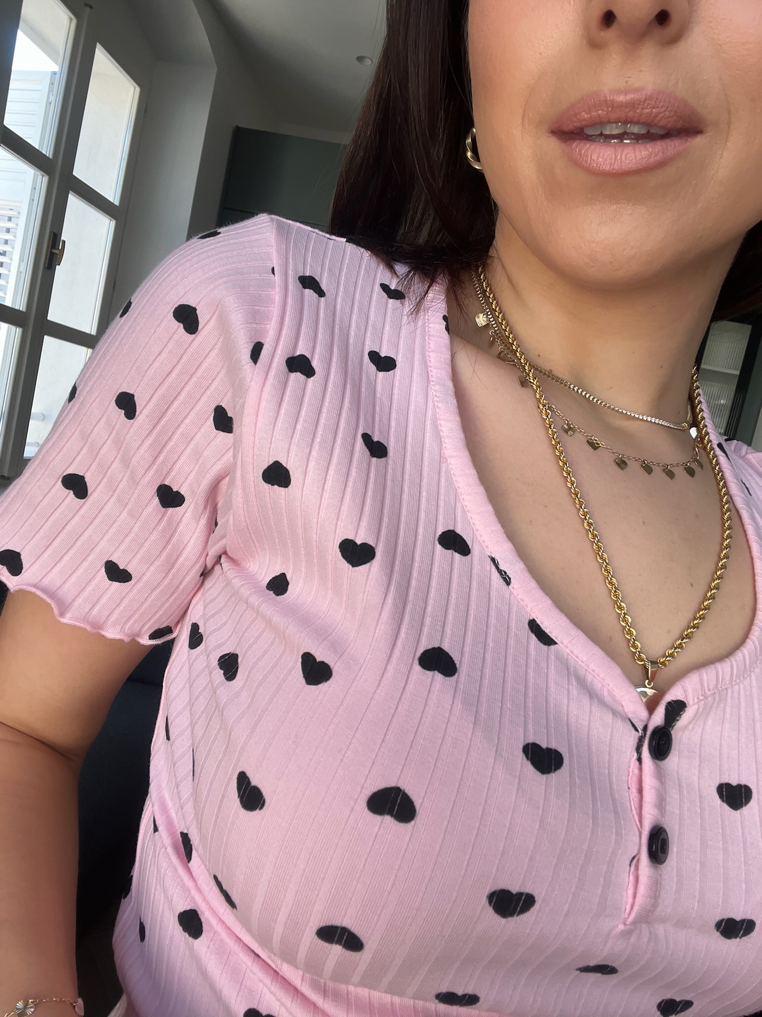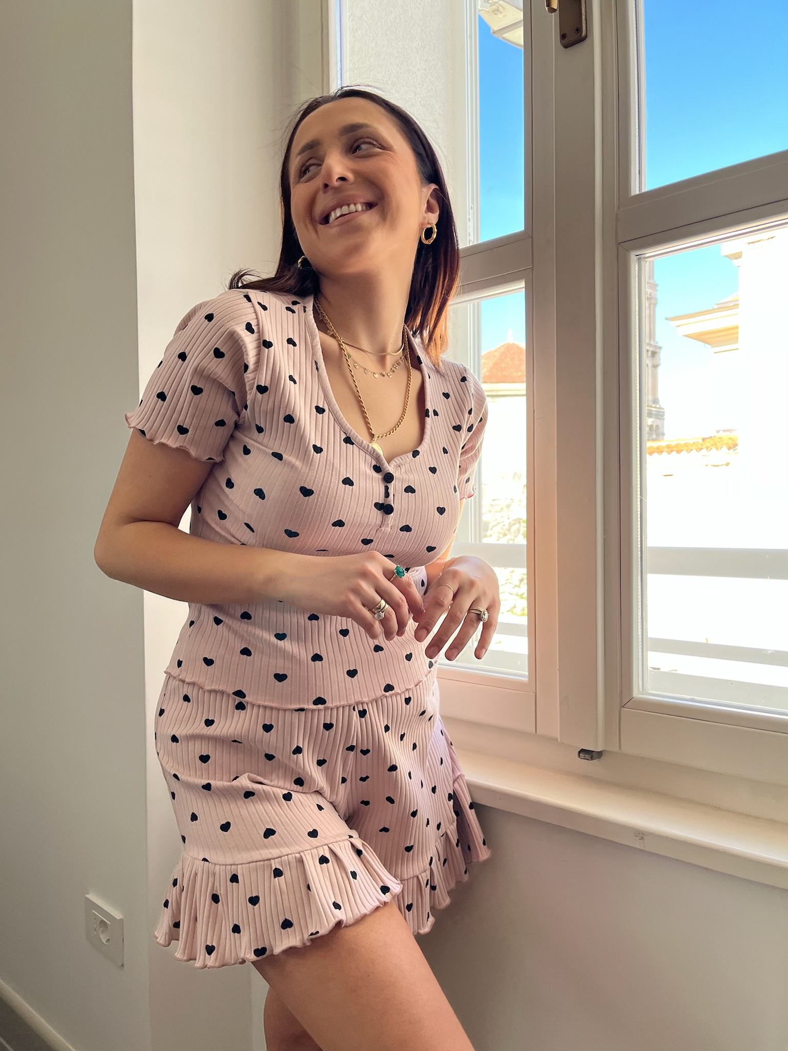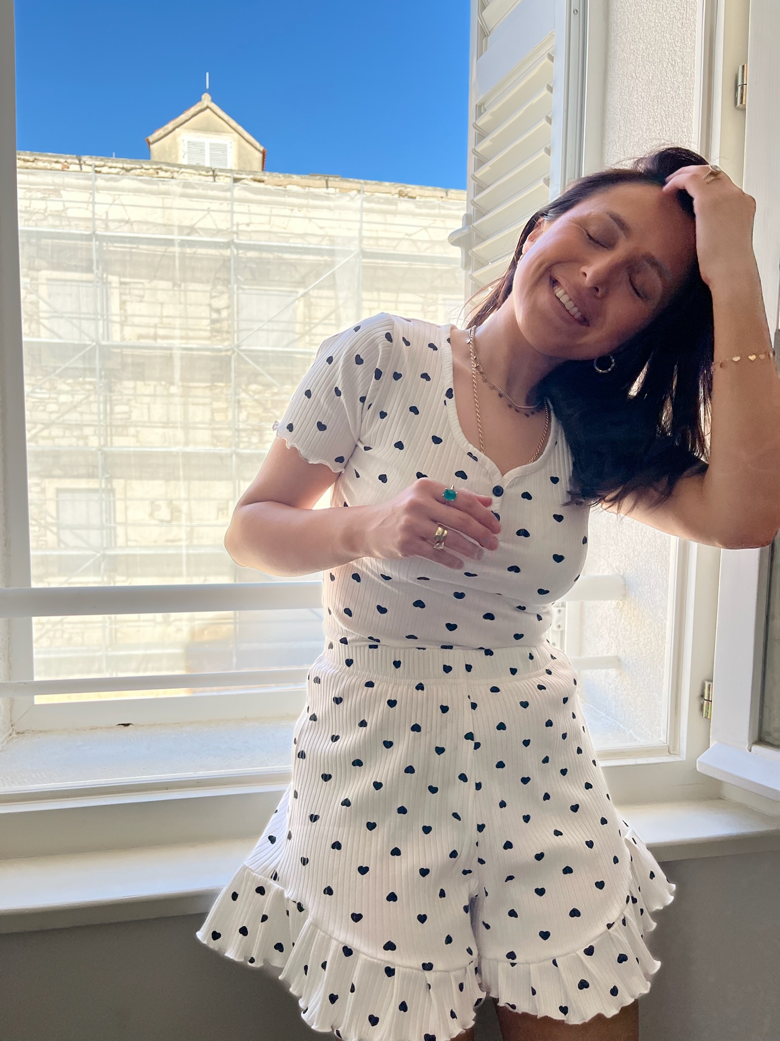 Ovaj set odiše svježinom i ženstvenošću, idealan za tople proljetne dane. Nježni dvodijelni komplet od laganog, rebrastog materijala u bijeloj boji, ukrašenom sitnim crnim srcima koji dodaju dašak razigranosti i romantike. Gornji dio je kratkih rukava s diskretnim valovitim rubovima, dok su kratke hlače visokog struka elegantno krojene i ukrašene volanima na rubovima, što dodatno naglašava opušten, ali dotjeran izgled.