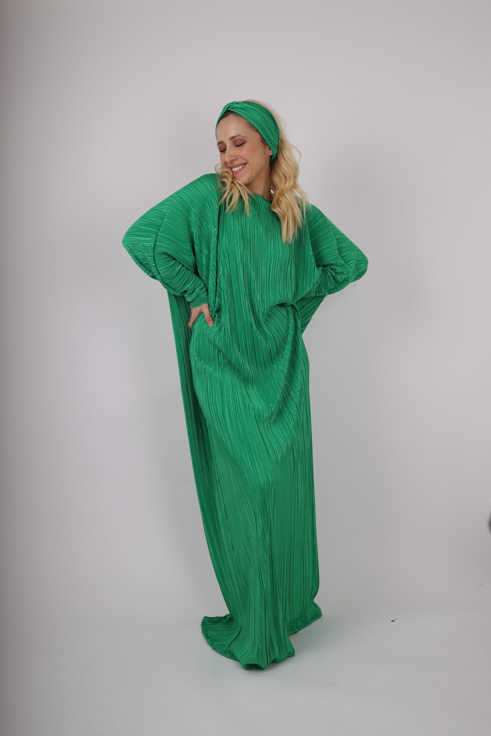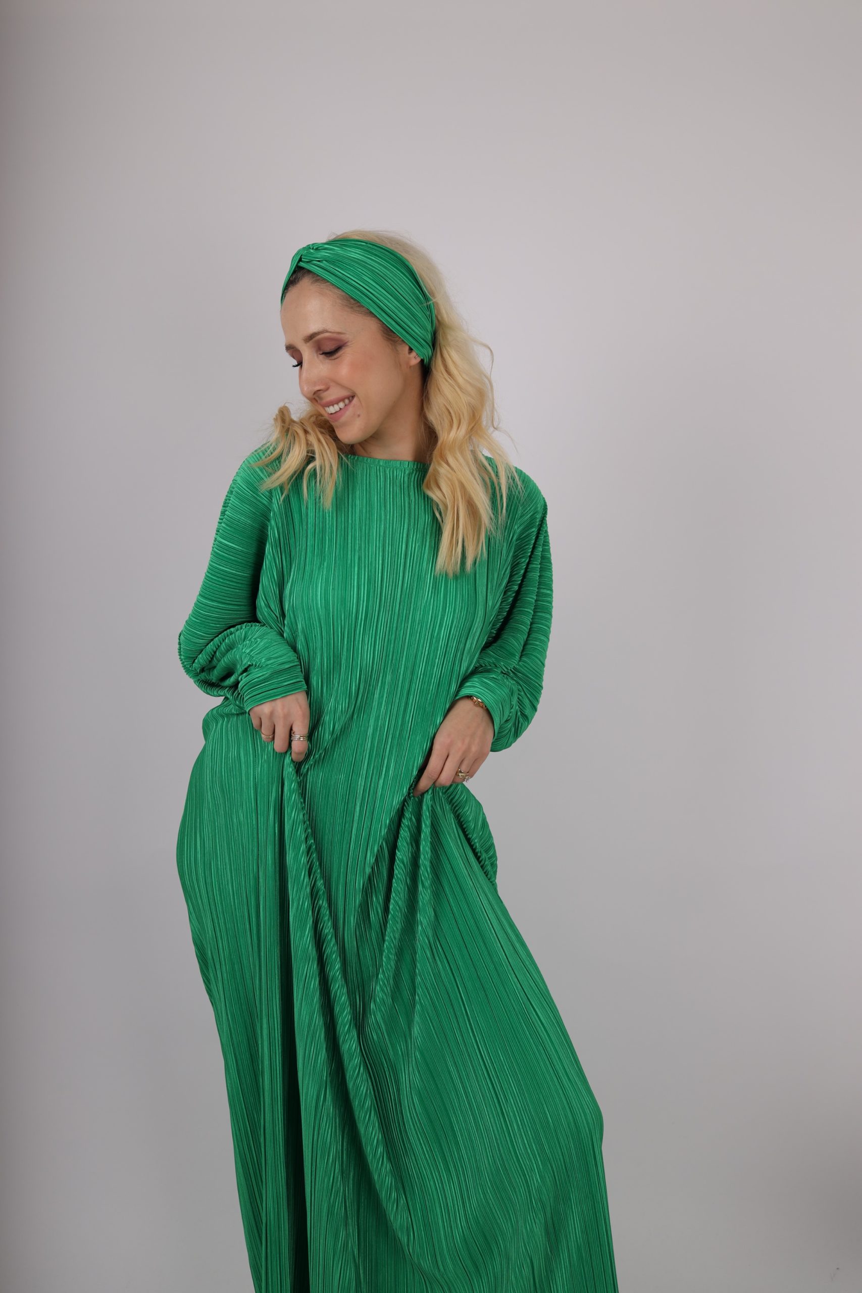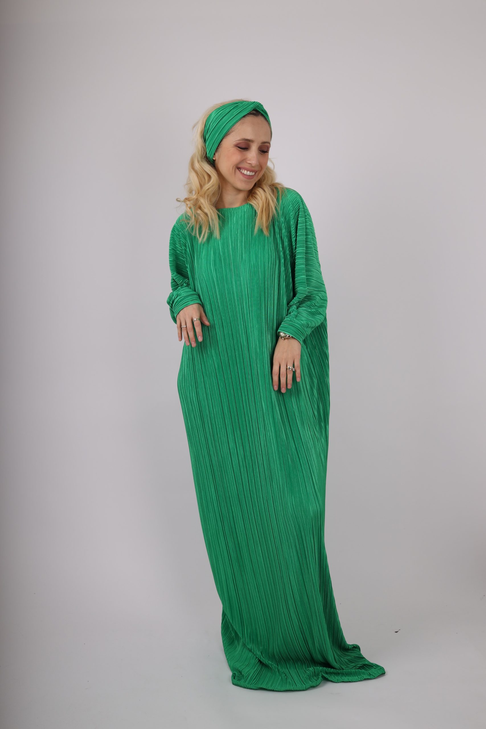 Duga haljina sa okruglim okovratnikom i dugim rukavima od plisiranog materijala.