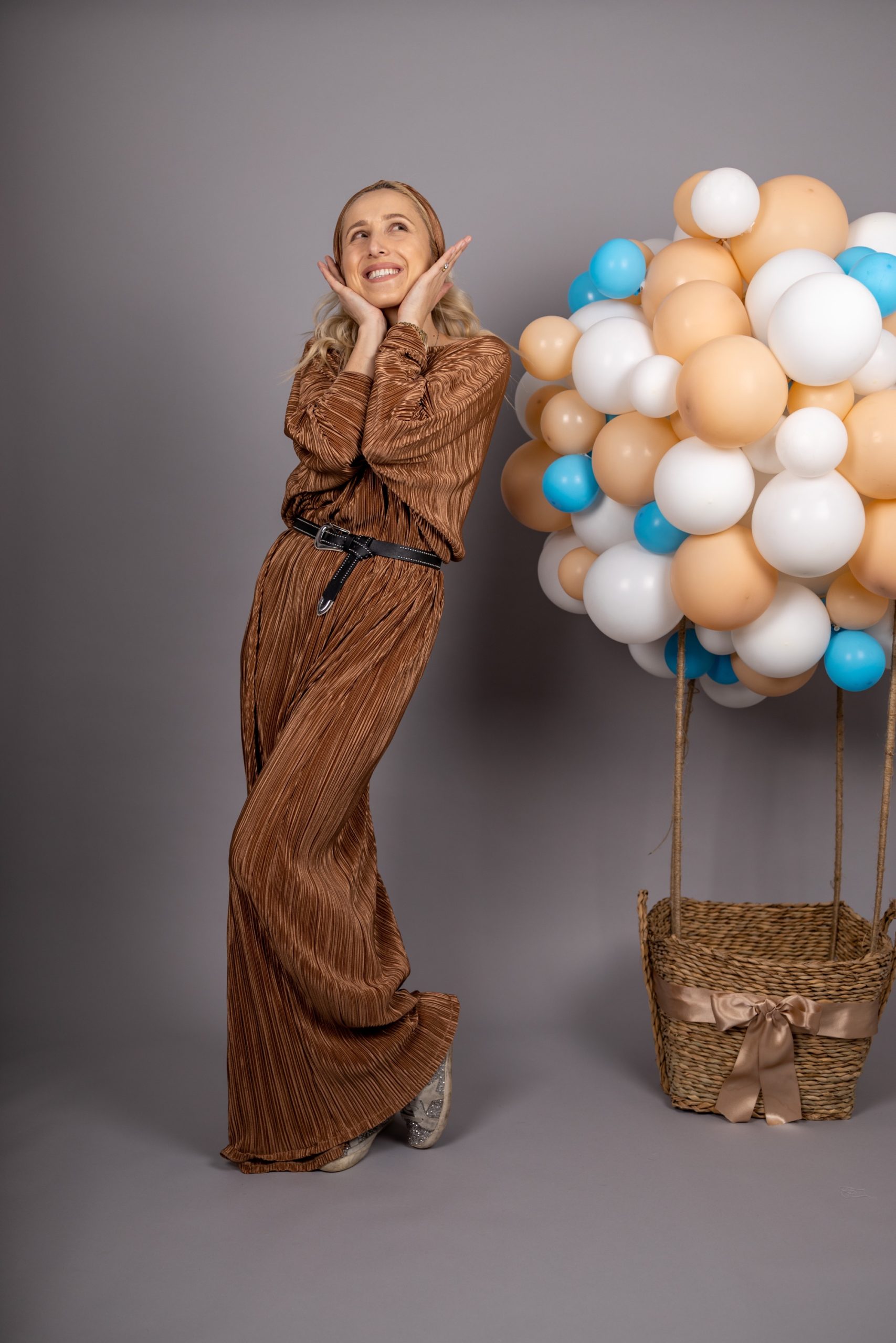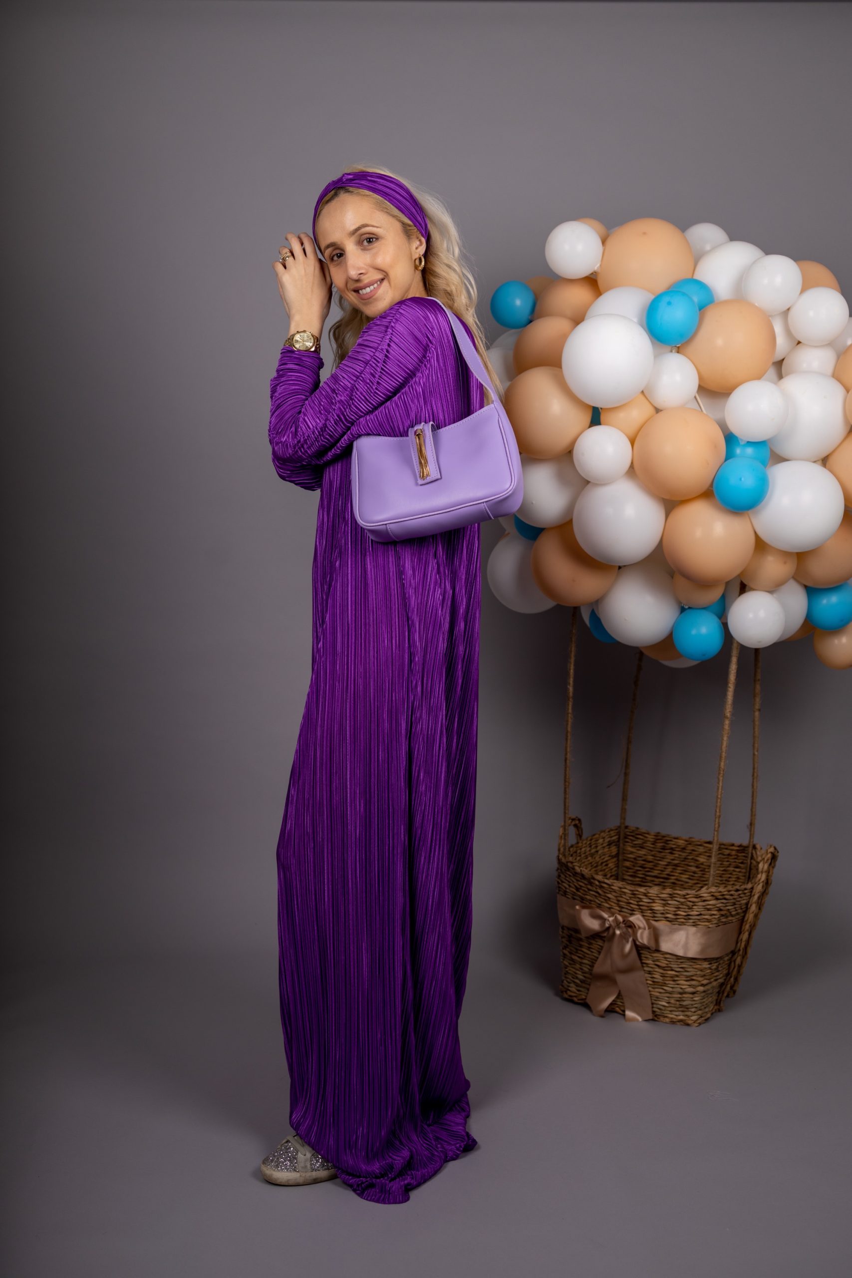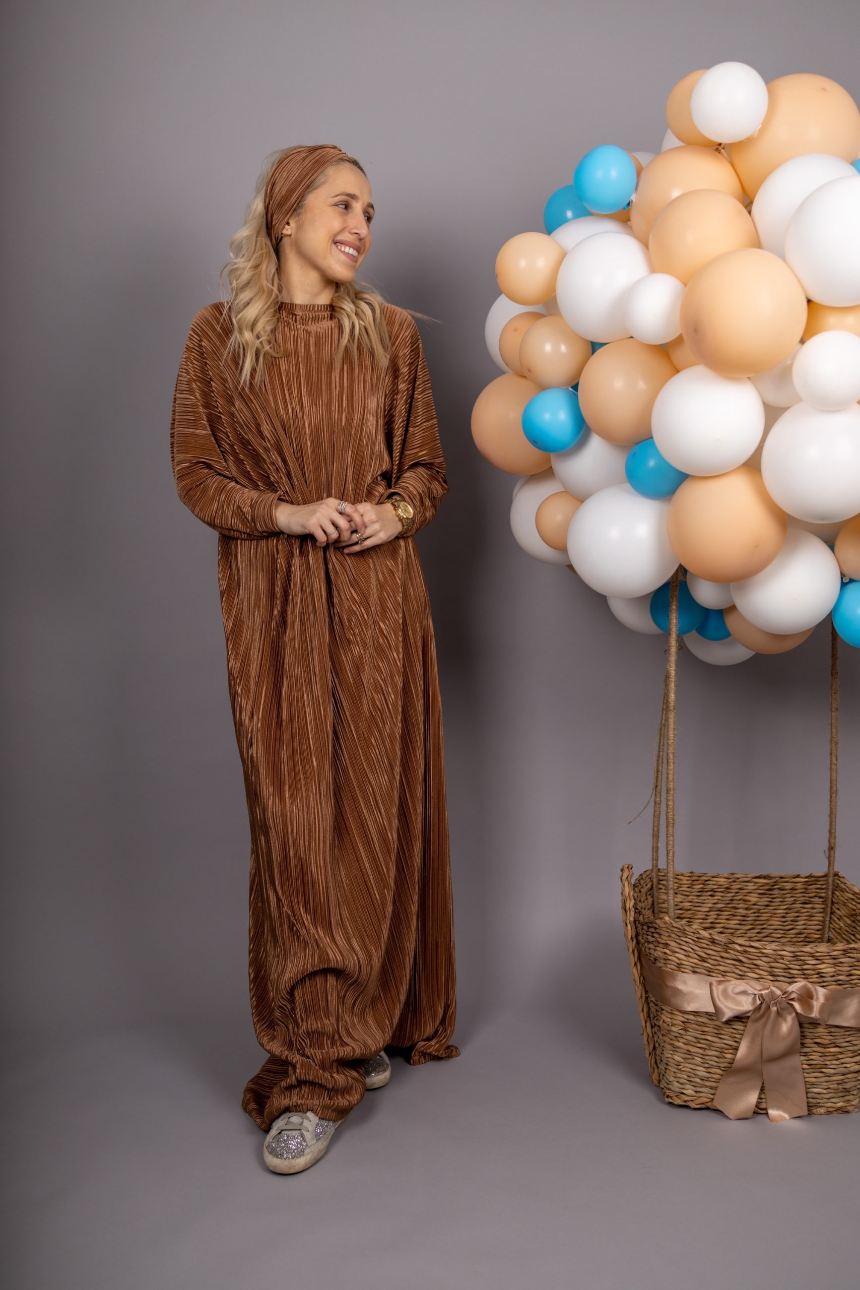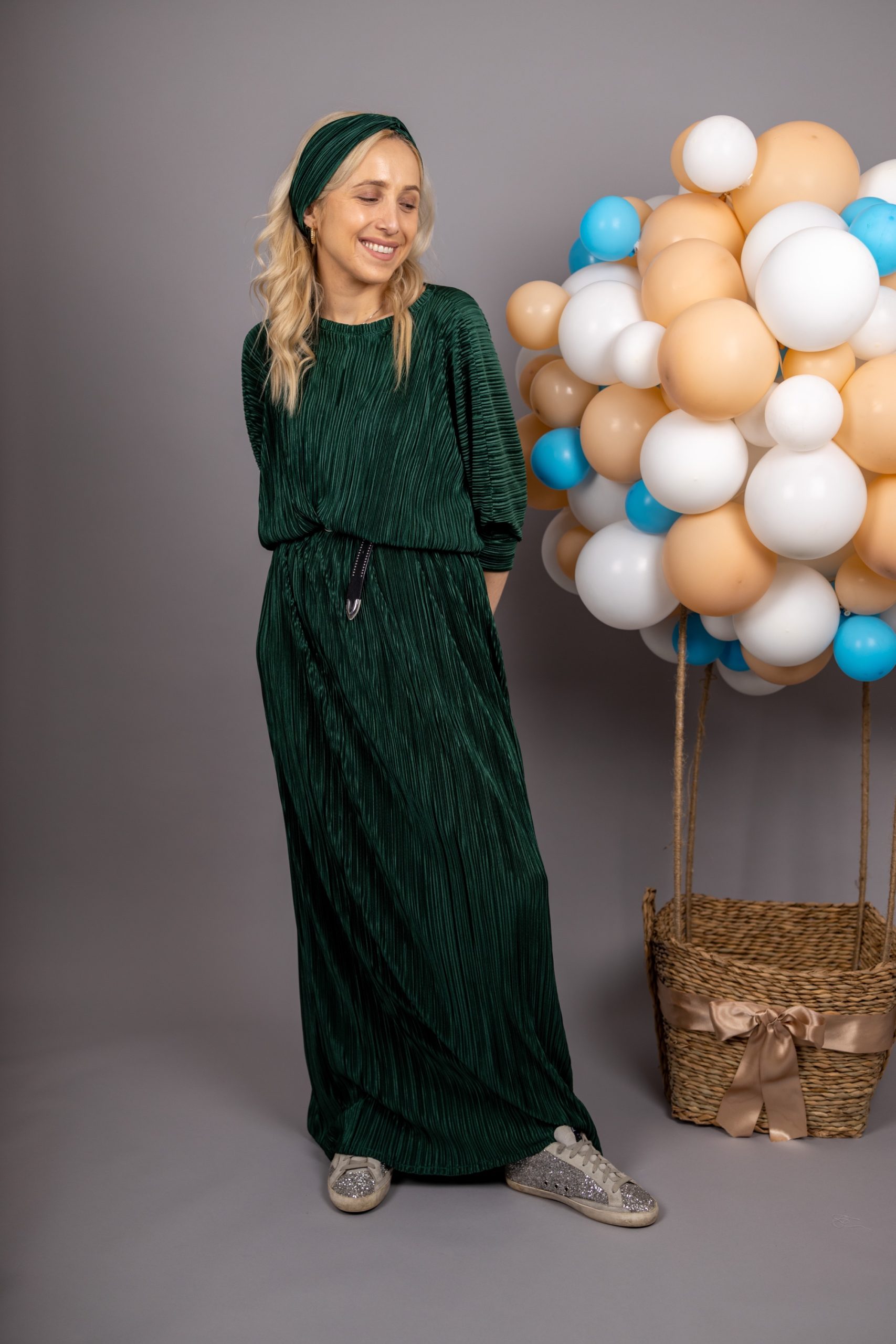 Duga haljina sa okruglim okovratnikom i dugim rukavima od plisiranog materijala.