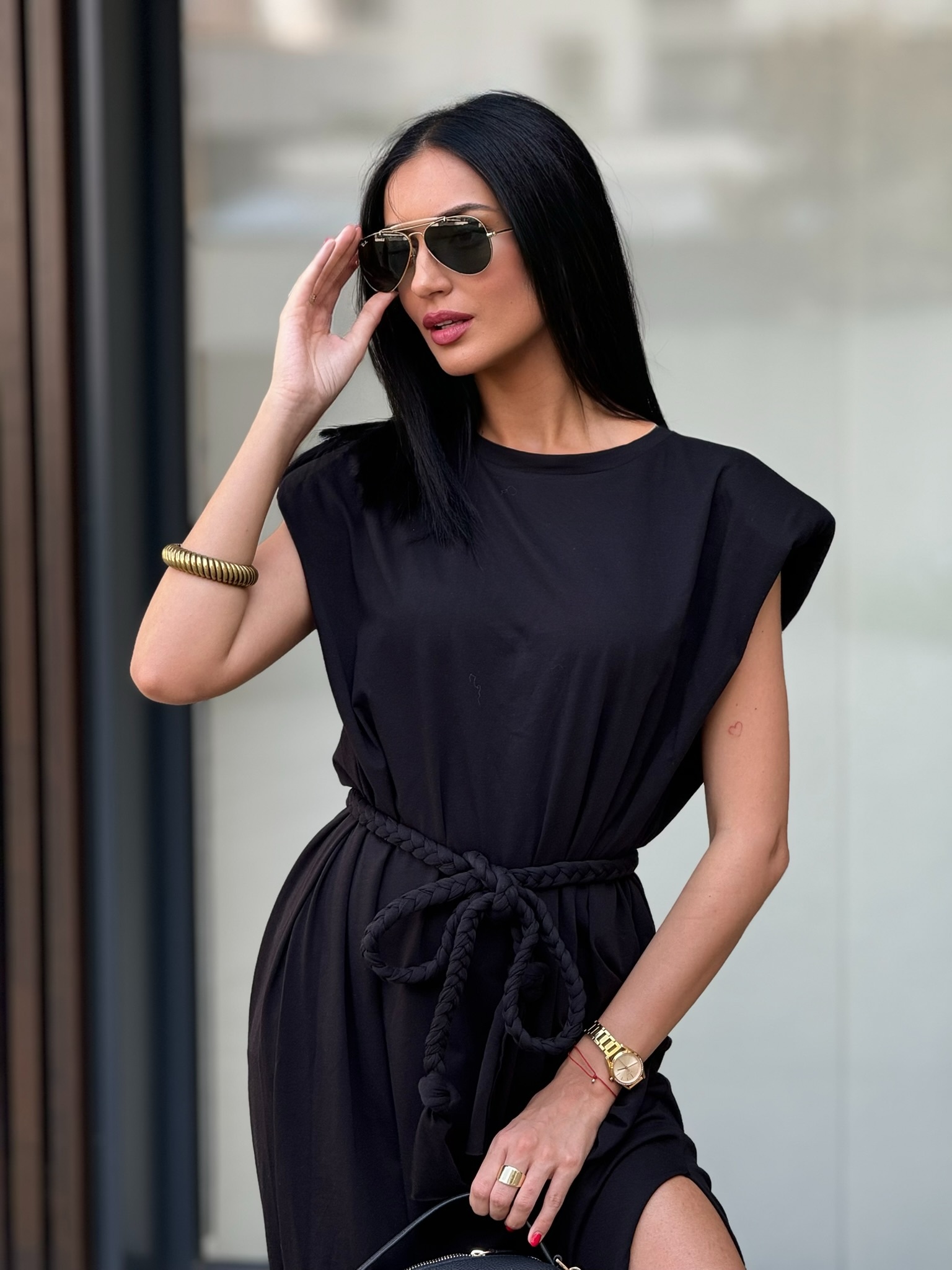 Duga haljina sa prorezom i naglašenim naramenicama.