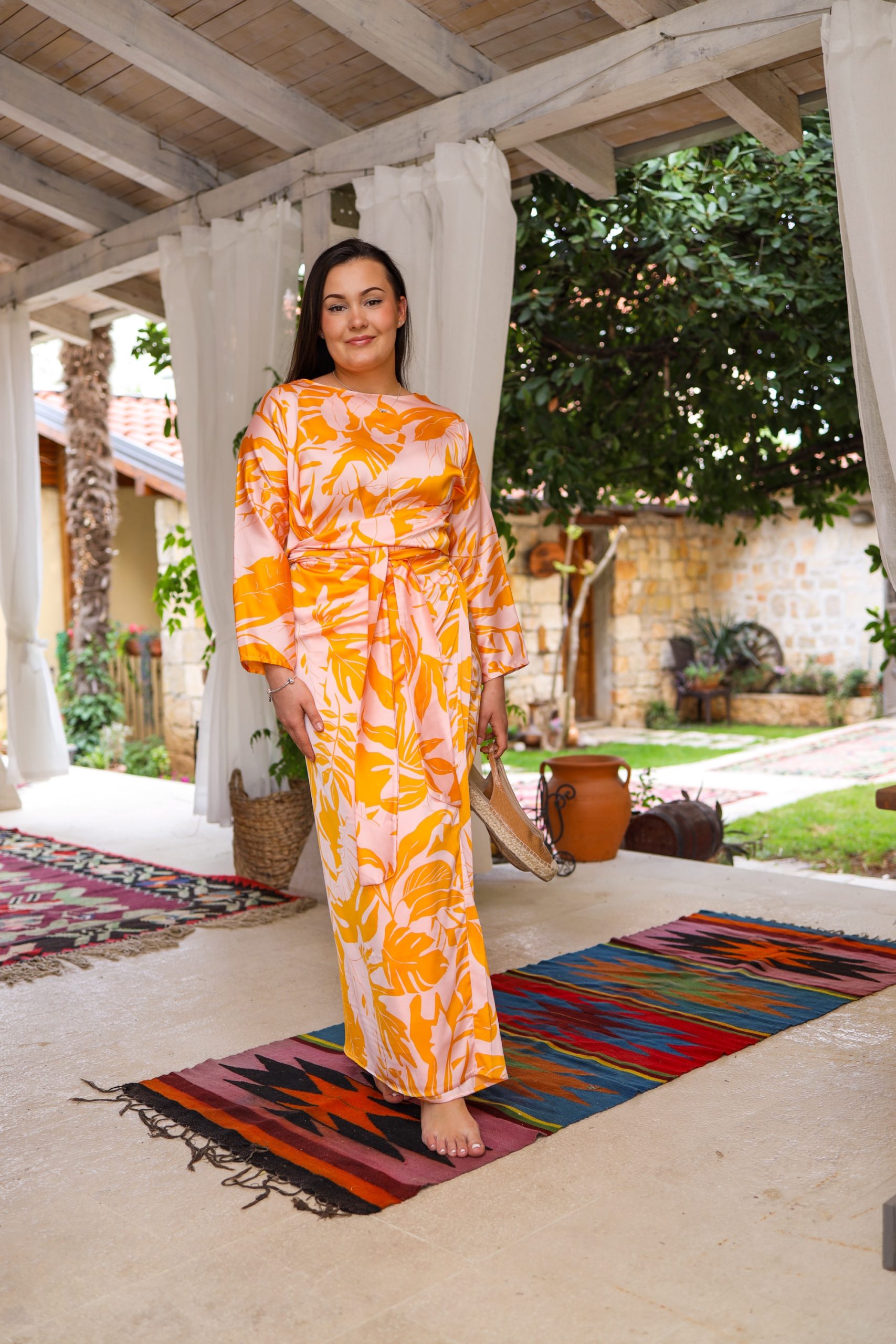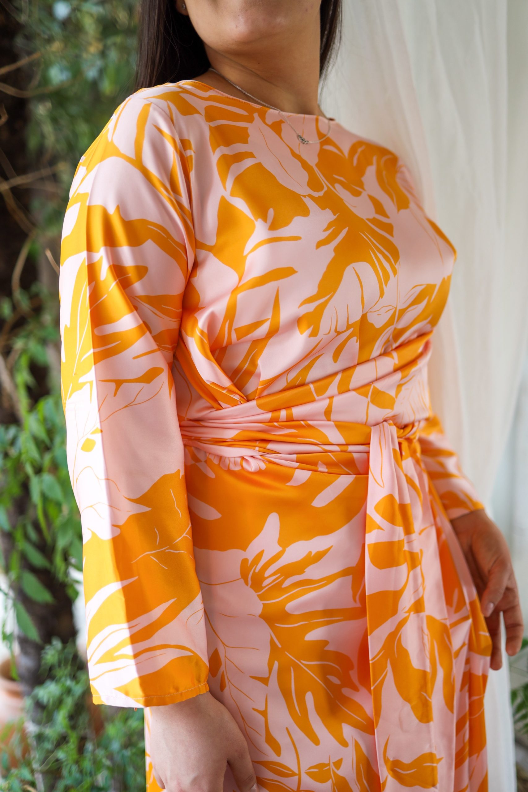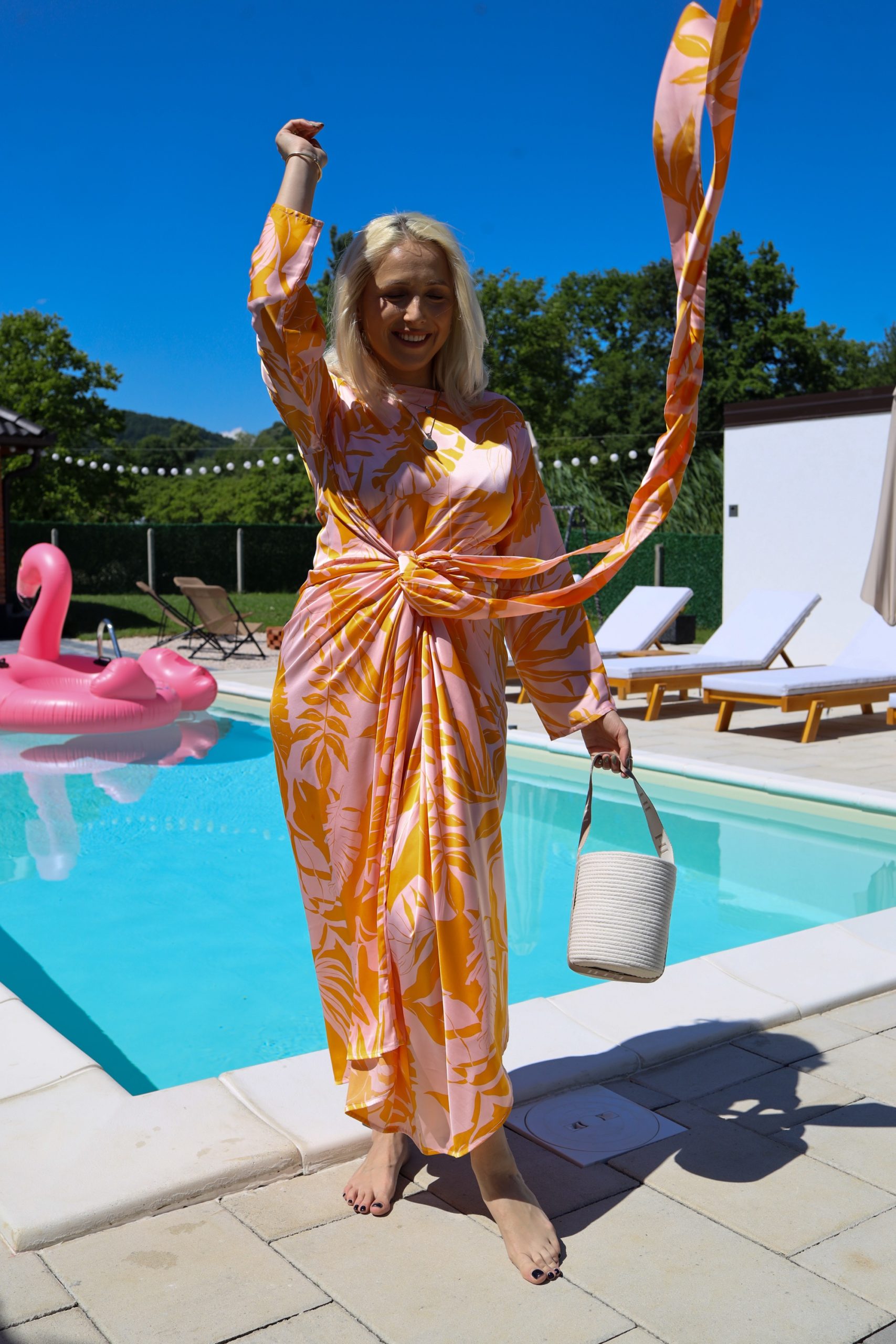 Valeria je divna satenska haljina sa narandžasto-rozim dezenom. Njen kaiš nosi bezbroj mogućnost kako se Valeria može stilizovati; može imati elegantan kroj prateći liniju tijela ili možete nositi opuštenu, širu verziju.